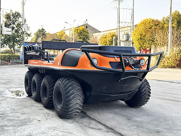 車體采用高分子復(fù)合材料真空一次成型,底盤(pán)采用高強(qiáng)度汽車大梁鋼材焊接而成,全密封設(shè)計(jì)適配全場(chǎng)景受力需求,同時(shí)確保車輛在水陸環(huán)境中均能保持穩(wěn)定。